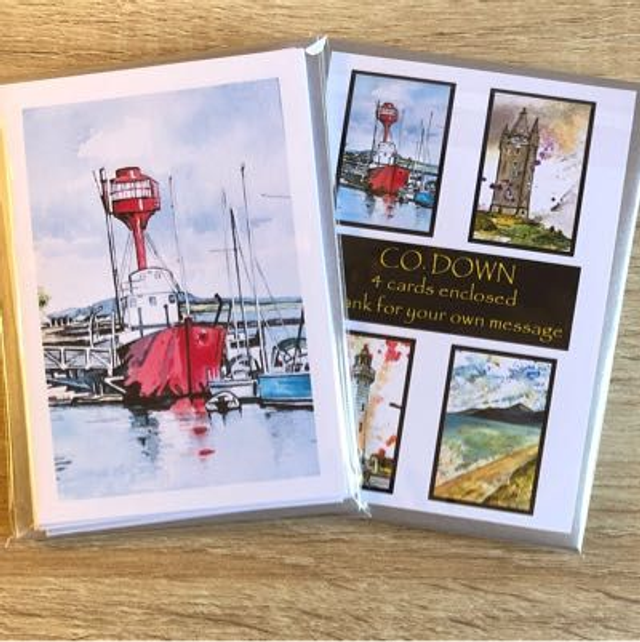 This mini pack contains 4 x A7 cards with silver envelopes. 74 x 105 mm. comprises 4 different cards; Ballydorn Lightship, Donaghadee Lighthouse, Scrabo Tower &The Mournes.