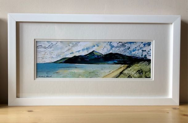 Framed fine art print of the Mournes with a conservation mount with a stay white core. Overall size including frame is 43 x23 cms and can be supplied in a white or grey frame