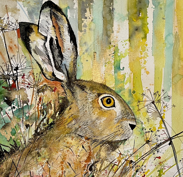 The frame is a warm grey solid wood frame. The overall size including the frame is 16 x 16 inches. The print is taken from a large original ink and watercolour painting and shows the hare in the woods with dappled light falling through the trees and highlighting the bracken. The price includes free UK postage and orders will be fulfilled as soon as possible.